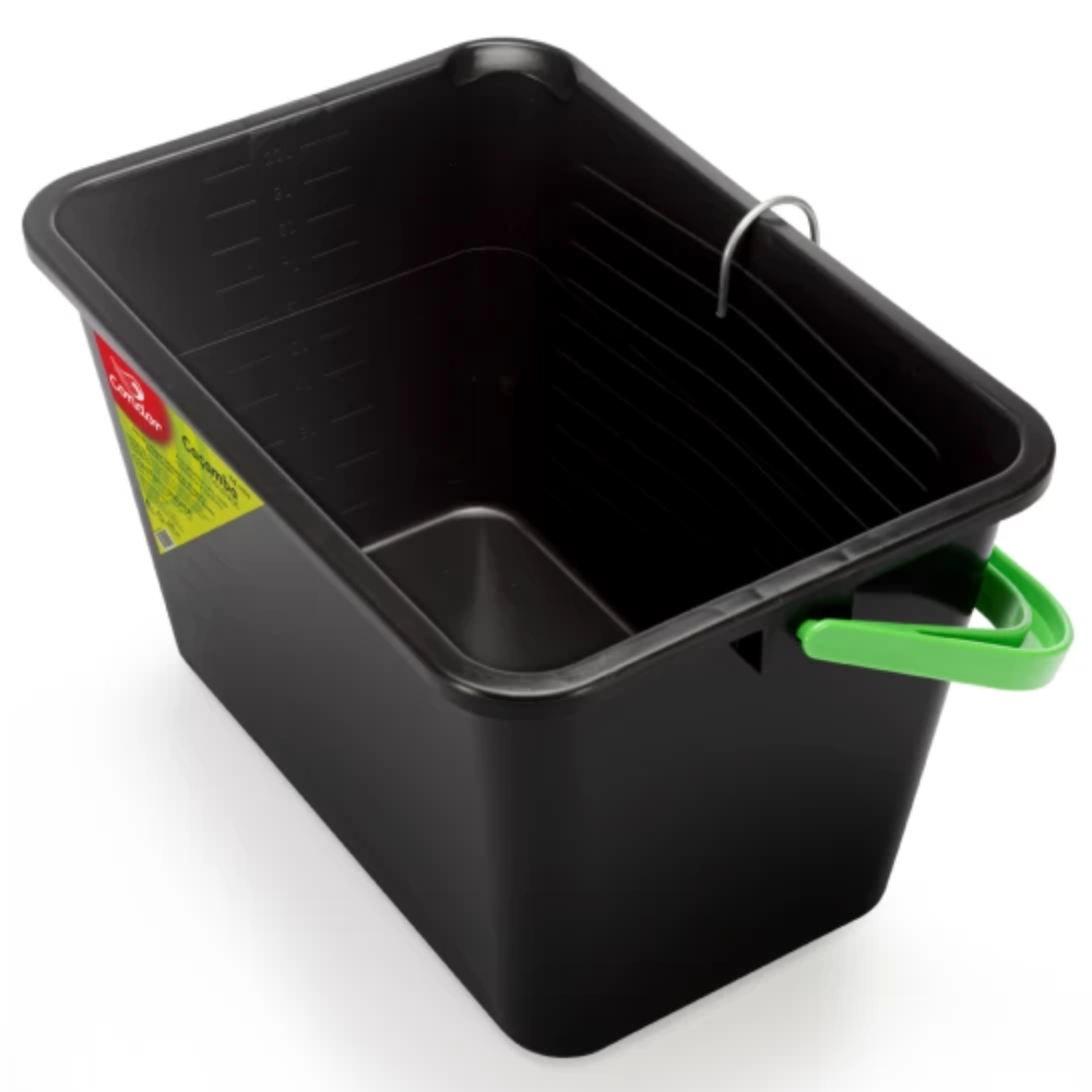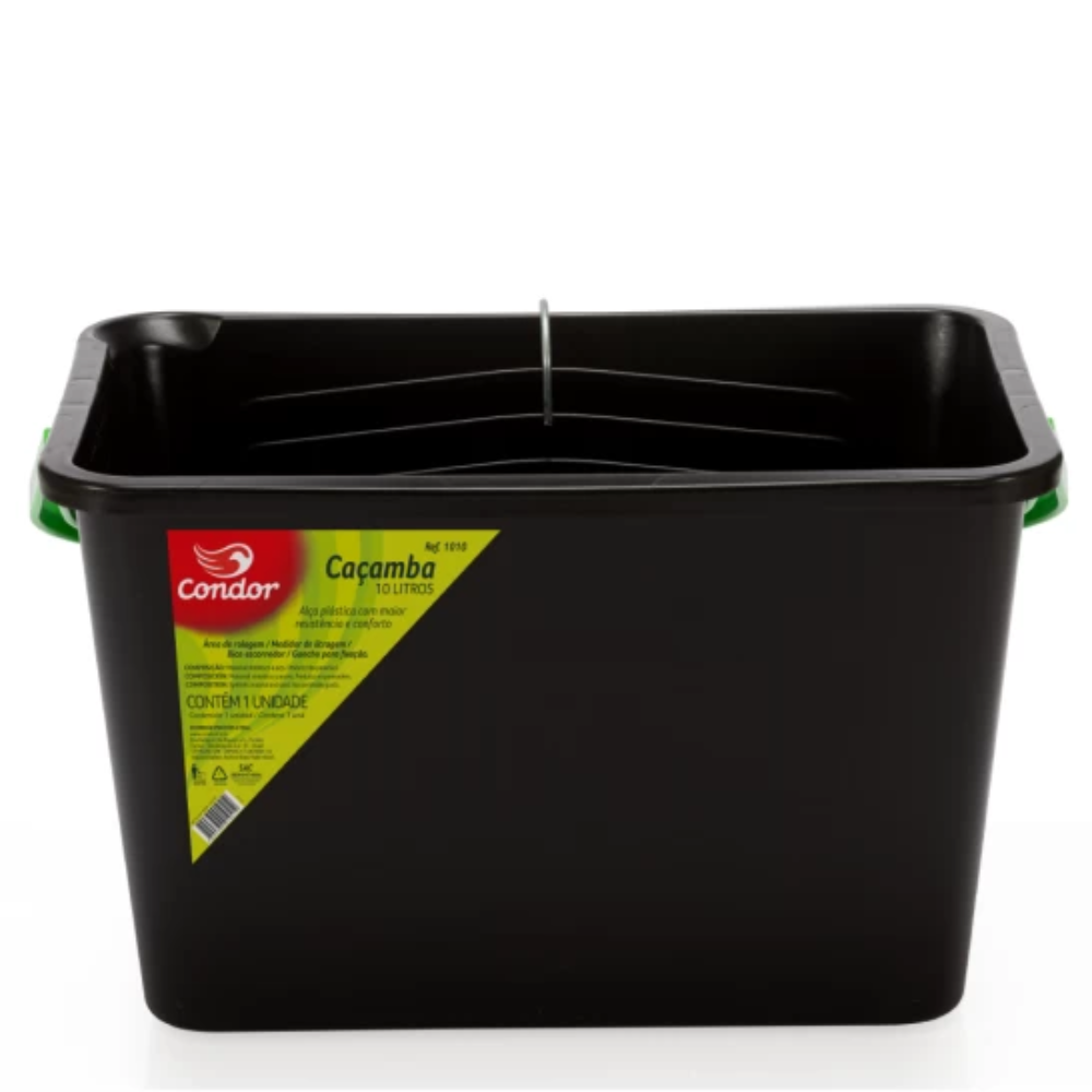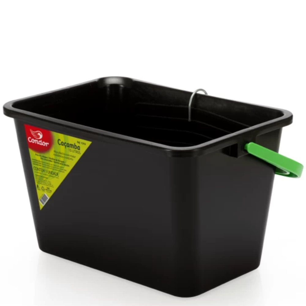 Caçamba para pintura com capacidade de 10 litros, desenvolvida para facilitar o trabalho em pinturas em geral, tanto profissionais quanto domésticas. Ideal para uso com rolos e trinchas em áreas médias e grandes.