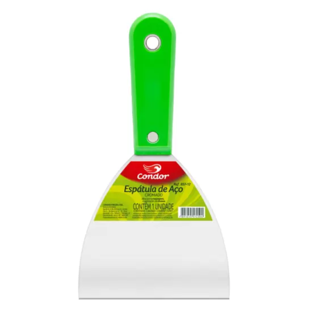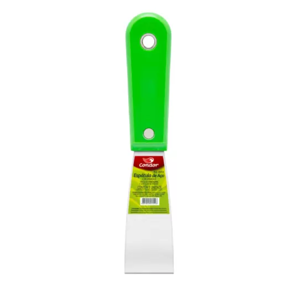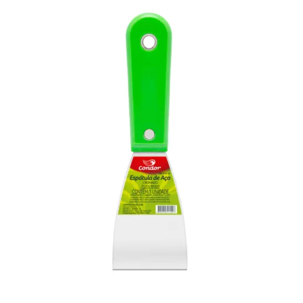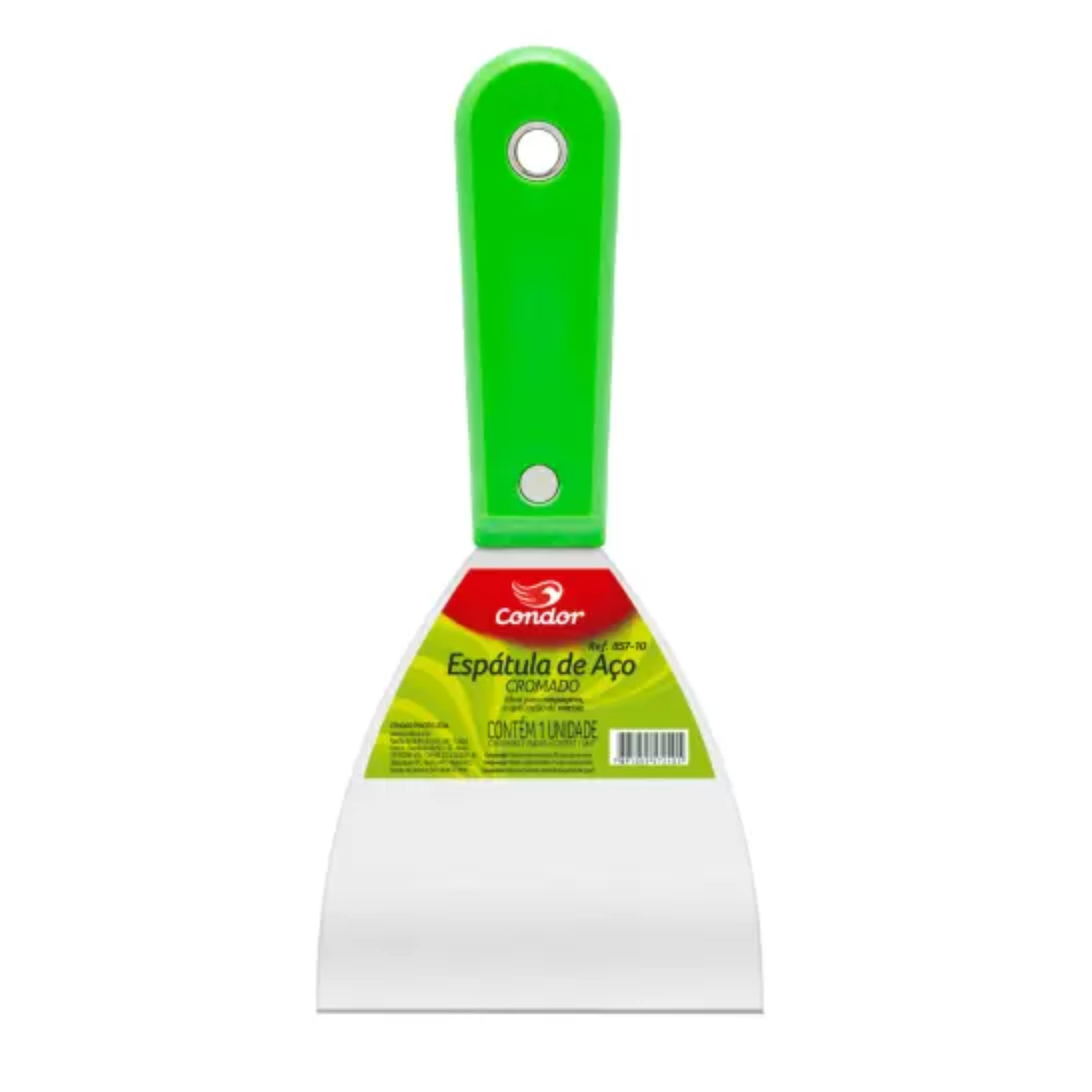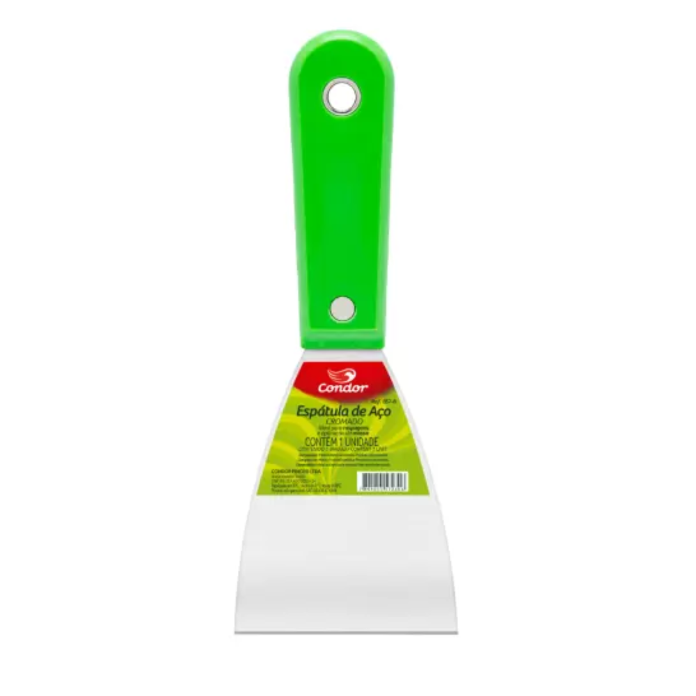 Espátula de aço indicada para aplicação, raspagem, correção e remoção de massas em geral, utilizada em pintura, construção civil e pequenos reparos.
