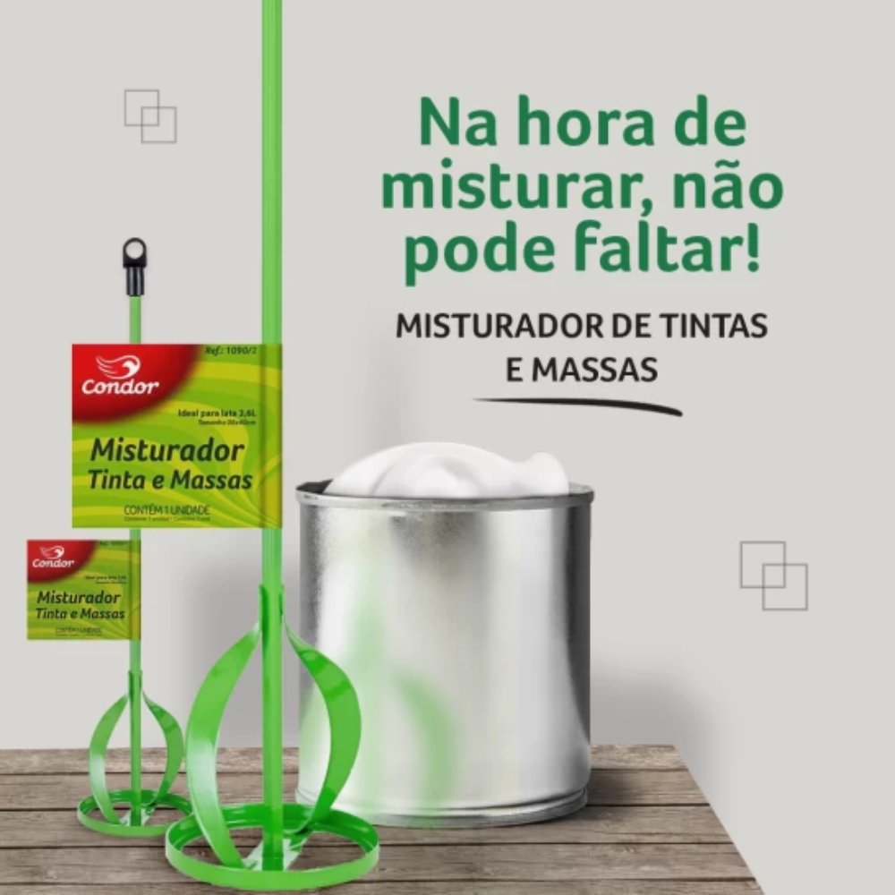 Misturador desenvolvido para uso acoplado em furadeiras, indicado para mistura mecânica de massas e argamassas na construção civil, garantindo melhor homogenização e produtividade, especialmente em baldes e recipientes mais profundos.